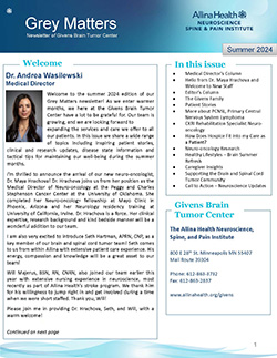 Our focus at Givens Brain Tumor Center is to support and understand what matters most to you beyond your physical condition. With each Grey Matters publication we will feature patient stories, highlight community resources, bring you information about our programs, services, research, and clinical trials; provide updates about our team, upcoming events, and share other relevant and interesting information about brain and spinal cord tumors. Our lens is focused on you, the patient, and the loved ones in your life. This is your newsletter.
