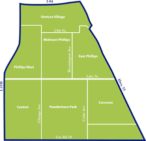 The boundaries are Interstate 94, Interstate 35W, 38th Street South and Hiawatha Avenue.