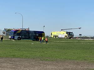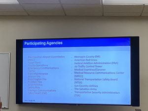 The scenario was this: an engine detached from an airplane during take-off which caused the aircraft to crash into a taxiway, slide through the perimeter fence of the airport before coming to a rest in the airport dog park, where it was engulfed in flames. Traveling on the plane were 130 people between crew and passengers. Buses were arranged on the field to represent the plane.