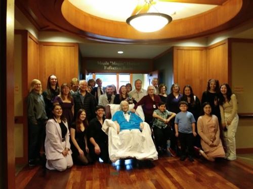Just 10 days after Pam moved into hospice, Becca and Tom were married in the Reflection Room of J.A. Wedum Residential Hospice. They were joined by about 20 close friends and family. Pam was in a special wheelchair arranged by the staff so she could sit up or lay down as needed. An uncle of Becca’s conducted the wedding ceremony, and another uncle played the guitar. The couple was toasted with apple juice so Pam could join in the moment. Wedum staff arranged for a volunteer pianist when guests were arriving.