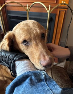 Laurie’s pack has grown since those early days with Arthur, who has since passed away. She has Ranger and his littermate Lily, both nearly 12 years old. Ranger is an equal opportunity comforter. Lily is more of an empath.