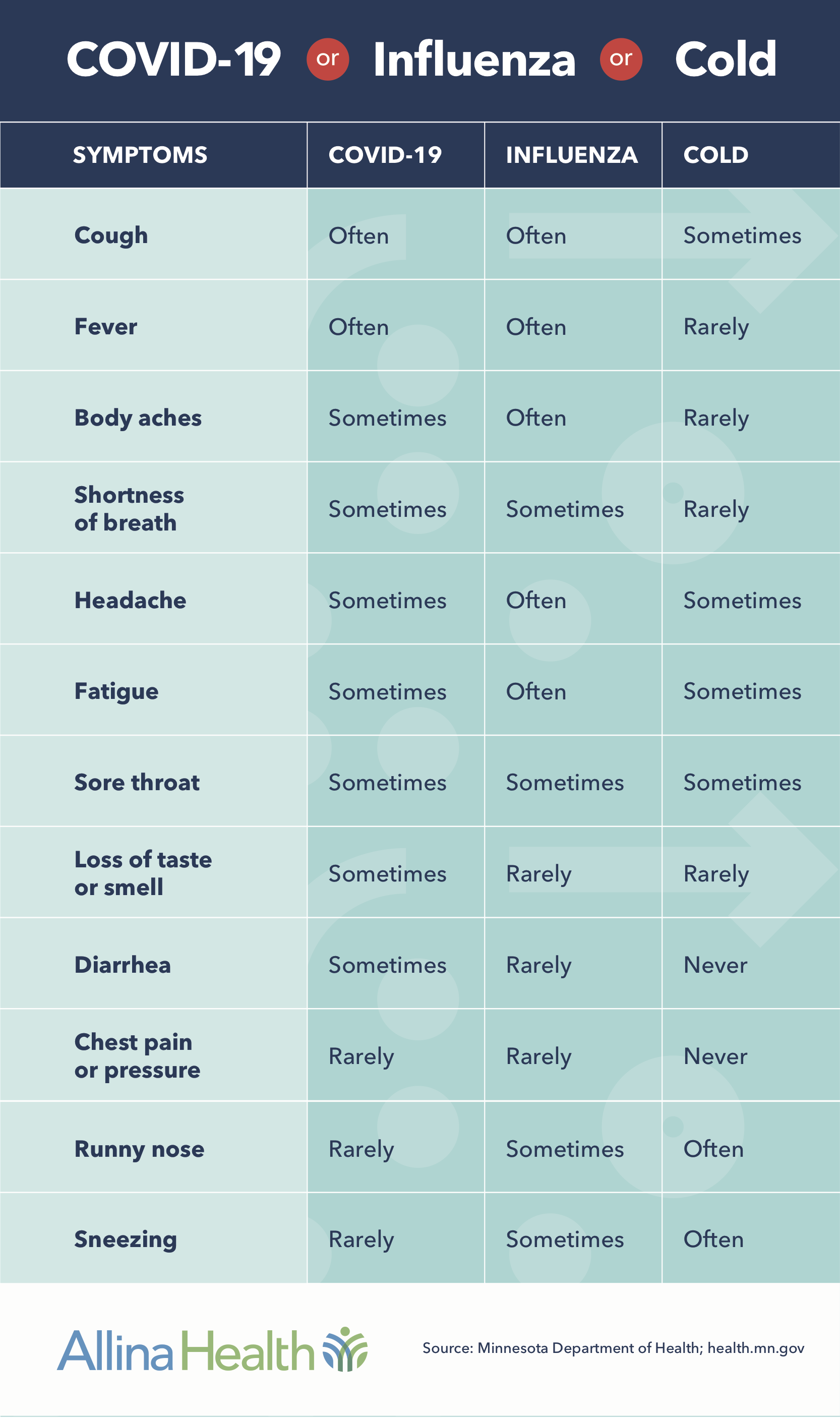*Allina Health requires an in-person or virtual visit to confirm if you need a COVID-19 or other tests based on your symptoms. Allina Health does not perform rapid testing. Schedule an appointment to meet with an Allina Health provider to discuss your symptoms and see if you qualify for a COVID-19 test.