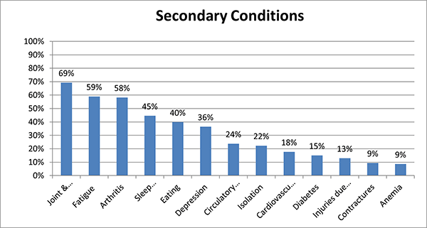 Persons were asked to indicate the number and severity of secondary conditions they have. Joint and muscle pain was the most commonly reported secondary condition, with 69% of total respondents reporting this condition. Next was fatigue (59% of respondents) and arthritis (58% of respondents).