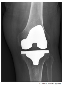 An X-ray shows the artificial joint (prosthesis) after a knee replacement.