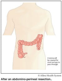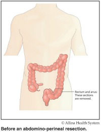 An abdomino-perineal resection removes the rectum and anus. Since these parts of the colon are removed, you will no longer have an anus. You will need to have an ostomy pouch.