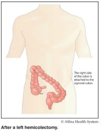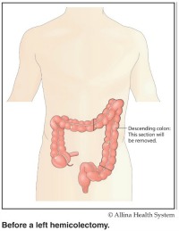 A left hemicolectomy removes the descending (left side) colon. The right side of the colon will be attached to the sigmoid colon.