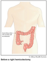 A right hemicolectomy removes the ascending (right side) colon. The rest of the colon will be attached to the small intestine.
