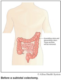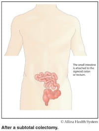 A subtotal colectomy removes the ascending (right side) colon and the descending (left side) colon. The small intestine will be attached to the sigmoid colon or the rectum. You may need to have an ostomy pouch.