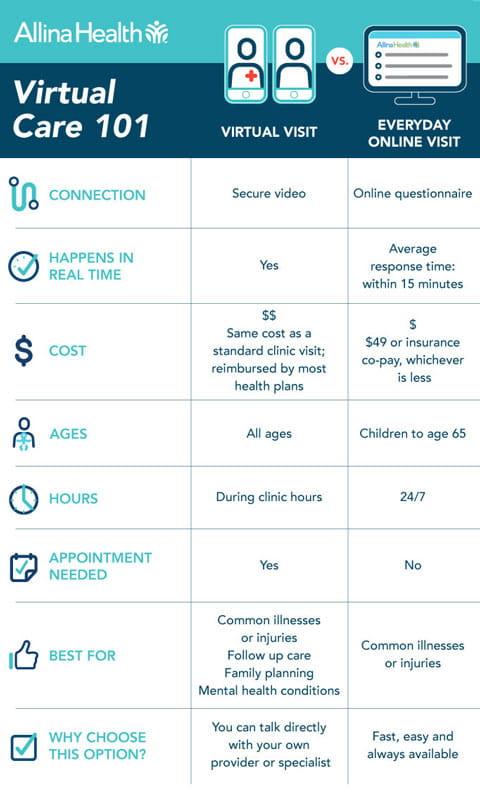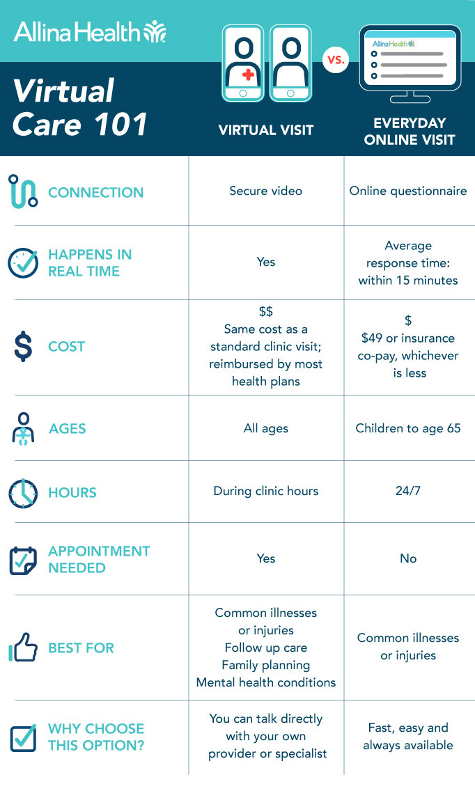Here is the infographic comparing virtual visits with Allina Health Virtual Care visits in an alternative format.
