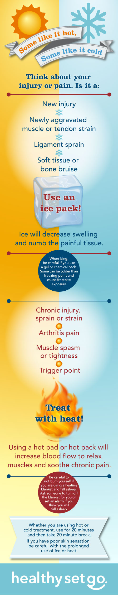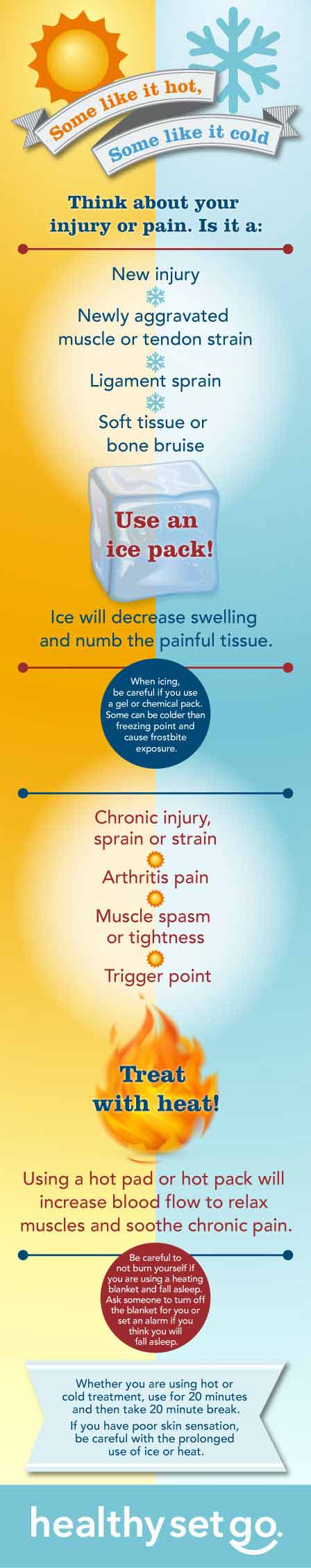 Whether you are dealing with a new injury or a chronic pain that has plagued you for awhile, it can be confusing to know how to alleviate the pain. Follow this easy to understand chart to determine if you should be applying heat or ice to your problem spot.