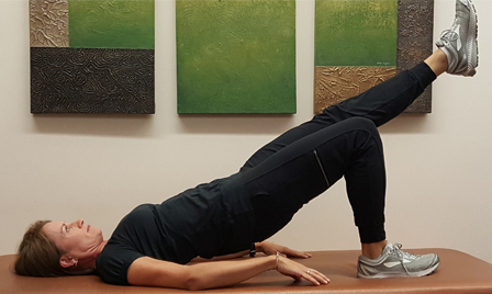 One leg bridge: Perform the bridge, but raise one leg so that it is in line with your shoulders and hips. Hold this position for 10 seconds and build up the length of time you hold. After resting, try again with the other leg.