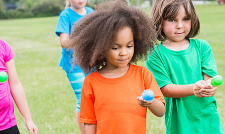 Arrange kids at the start line with eggs resting in spoons. The hand that is not holding a spoon should be tucked behind their backs. Kids should race to cross the finish line with their eggs still balanced on their spoons. If the egg falls, then it's back to the starting line!