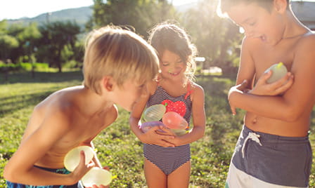 Mark a start line and various distances on the ground. Each child gets three attempts to see who can throw their water balloon the farthest. Encourage kids to try the shot put "glide" (start with back facing the direction of the throw, glide backward in the direction of the throw, then turn and release the shot put all at once) and "spin" technique (start with back facing the direction of the throw and use a whipping motion to run and pivot into the release) to add a little challenge and silliness.