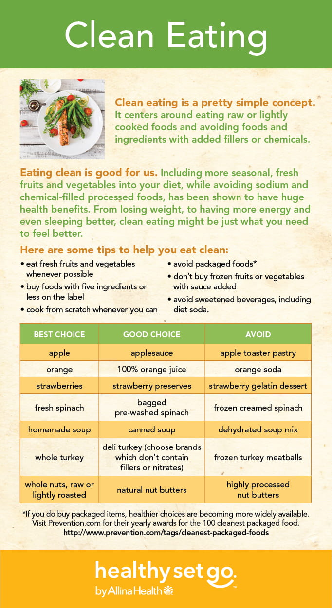 This infographic talks about clean eating. Clean eating is a pretty simple concept. It centers around eating raw or lightly cooked foods and avoiding foods and ingredients with fillers or chemicals added. Eating clean is good for us. It includes eating more seasonal, fresh fruits and vegetables in your diet, while avoiding sodium- and chemical-filled processed foods. It has been shown to have huge health benefits from losing weight to having more energy and even sleeping better. Clean eating might be just what you need to feel better.
