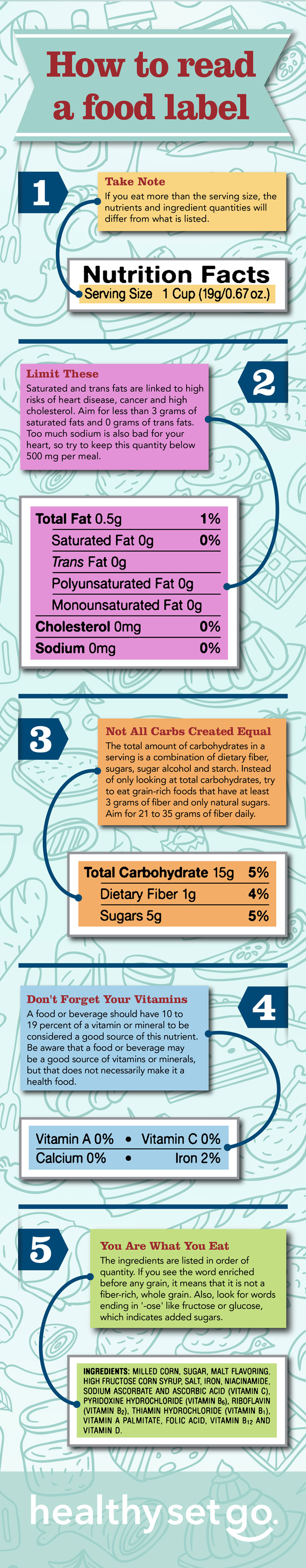 The Nutrition Labeling & Education Act of 1990, which required nutrition labeling for most foods was intended to make it easier for consumers to plan healthy diets. This may seem hard to believe considering how confusing it can be to decipher what is good and what is bad on a food label. In the visual below I've broken down the top five things you should pay attention to when reading a food label.