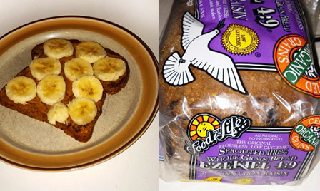 A slice of it toast with peanut butter and banana slices is a great way to start my day. I absolutely LOVE peanut butter and include it in my breakfast five days a week. I'm a creamy fan and choose a natural brand for its two ingredients: peanuts and salt. I've always liked raisin bread, and a few years ago I discovered the Ezekiel cinnamon raisin bread.