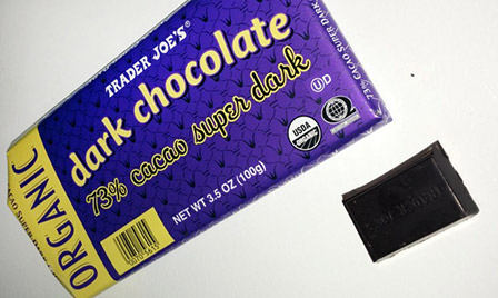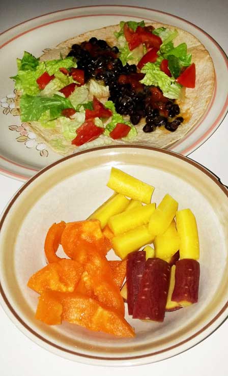 Wednesday dinners tend to be foods that can be put together in 15-20 minutes since there's not much time between getting home from work and shuttling my boys to church activities. I keep certain staples on hand, such as black beans and whole wheat tortillas. For quick meals, I usually rely on raw veggies (the purple and yellow carrots are a favorite "fun food") and maybe a fresh fruit to round out the meal. I am a particularly fond of dark chocolate so I complete my meal with a couple squares of bliss!