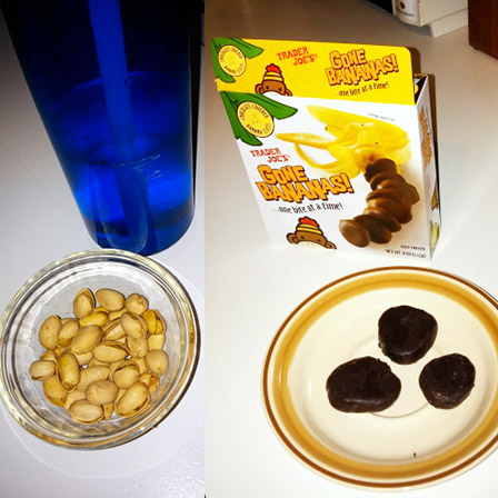Between driving my boys to their activities, I was able to meet a friend to walk. Afterwards, I found myself feeling hungry and knew I needed something that would satisfy me, which, for me, means some protein and healthy fat. Being a non-meat eater, a small portion of nuts is often the answer. Pistachios are so delicious and I know how easy it is for me to consume a lot of them, so I poured some into a small bowl. My sweet tooth didn't get completely satisfied from the dark chocolate earlier so I finished my day with a couple chocolate covered banana treats from Trader Joe's. It might have been a mistake to discover these little snacks, but honestly, deliciousness comes in small packages! Just a couple of of these does the trick for me!