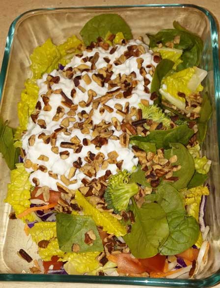Taking my lunch to work helps me save money and helps me follow the 80/20 rule. I do the majority of my lunch prep the night before. I put together my salad last night at the same time I was fixing a salad for dinner when all the ingredients were out on my counter. Night time lunch prep while working on dinner makes the time involved minimal.
