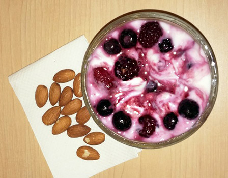 Mornings are when I am the hungriest, so I have a morning snack nearly every day. I alternate between plain organic yogurt with either fresh or frozen berries to naturally sweeten the yogurt or a piece of fruit and almonds...how many almonds depends on how hungry I am! I eat about one ounce of almonds most days as I really like the crunch. I often divide my portion of almonds between my morning and afternoon snacks because the protein and unsaturated fat in almonds keeps me satisfied.