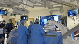 The room blends the capabilities of a cardiovascular catheterization laboratory where minimally invasive heart procedures are performed with a traditional surgical suite where open heart surgeries are performed. The suite, which is large enough for a dozen clinicians to work seamlessly, also features robotic three-dimensional imaging.