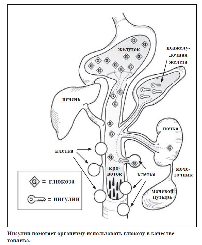 Действие инсулина можно сравнить с ключом, открывающим клетки организма для поступления в них глюкозы – источника энергии. Инсулин выполняет такую же функцию в организме, как ключ зажигания в автомобиле. Автомобилю нужно топливо, и ключ обеспечивает возникновение искры, а тем самым и поступление топлива в двигатель. В человеческом организме инсулин обеспечивает возникновение «искры» для поступления глюкозы (топлива) в клетки тела.