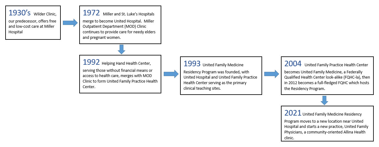 Our history of providing health care to the city’s neediest citizens extends back almost 70 years, when The Wilder Clinic, our predecessor, first offered free and low-cost health care at Miller Hospital. While health care resources and delivery have evolved in our community, our mission of providing comprehensive, community-oriented care remains firmly in place. Our current clinic, United Family Physicians, allows us to continue expanding our longstanding, deep-rooted commitment to our patients and the West 7th Community we serve. We are experiencing the benefits of being just around the block from United Hospital, our core teaching site and contributing to the vitality of a core area of Saint Paul. Our patients benefit from free parking, proximity to the bus lines and easy access to hospital and other Allina Health services.